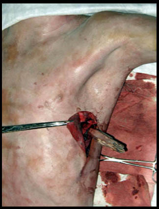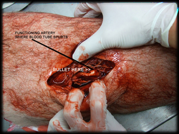 GUNSHOT WOUND TO THE LEFT THIGH , EXTRACTION OF BULLET AGAINST FEMORAL ARTERY